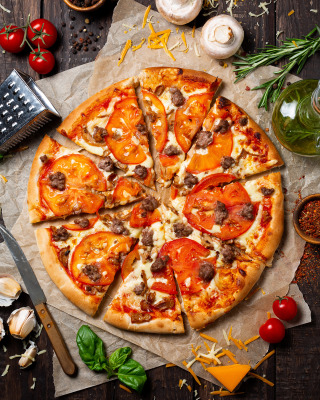 Грибы, помидоры, фарш свинина, говядина, соус чили, сыр.