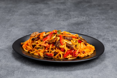 Лапша "Удон" с говядиной, перец болгарский, лук, остро-сливочный соус.