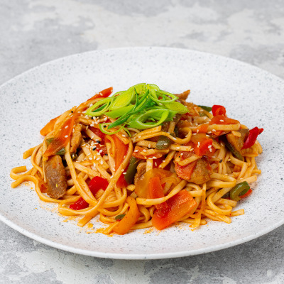 Лапша удон, лук, морковь, перец болгарский, свинина острый соус.