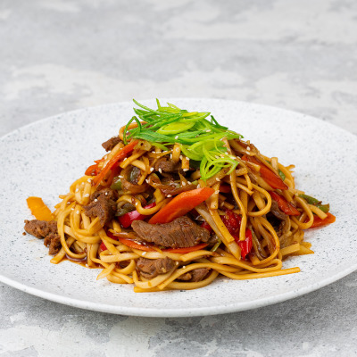 Лапша удон, лук, морковь, перец болгарский, говядина, соус Якинику.